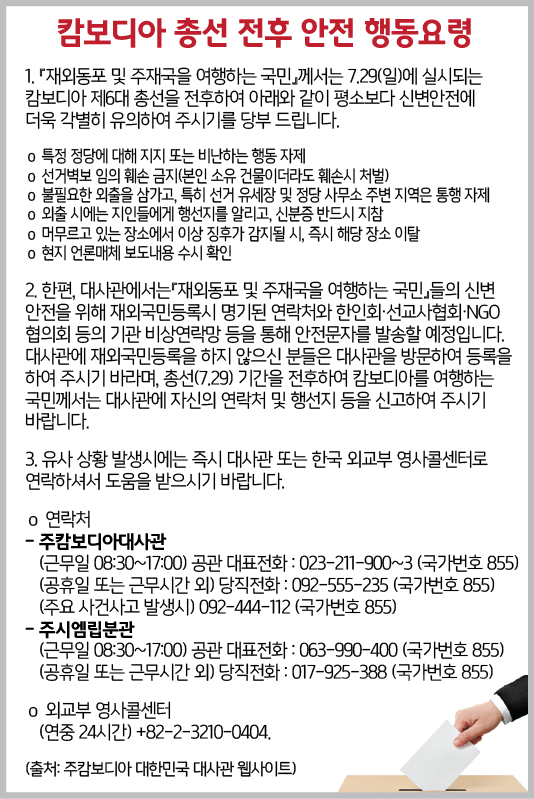 오는 7월 29일은 캄보디아 제6대 총선일이다. 7월부터 매 주말마다 프놈펜 전역과 국도에는 오토바이, 차량을 동원한 선거 운동 행렬이 끊이지 않고 있다. 캄보디아에 살고있는 한국 교민에게 캄보디아 총선은 어떤 의미로 다가올 수 있을까? 행여 정치 불안, 치안 불안 이어질 수 있는지 아니면 그저 유세 때문에 교통 정체가 심해지는 것에 불과한지….