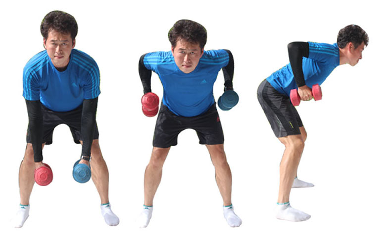 - 등을 곧게 펴고 팔은 11자로 늘어뜨려 덤벨이나 물통을 영손이 마주보게 잡는다.