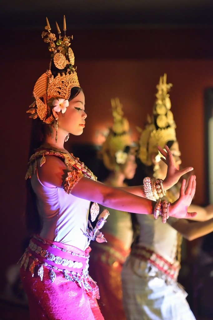 ▲ 쩜뻐이 꽃으로 귀를 장식하고 왼쪽 손목에는 말리 꽃팔찌를 한 압사라춤 무용수. 참고로 쩜뻐이 꽃을 오른쪽 귀에 장식하면 미혼, 왼쪽 귀에 장식하면 기혼임을 표시