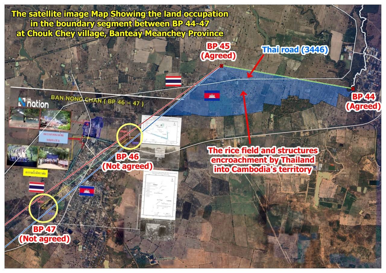 얼마 전 태국 육군 부대변인과 태국 사깨오주 주지사 등 태국 관계자들이 위성 지도와 일부 공식 문서를 제시하며 쁘레이 찬과 쪽쩨이 마을 일대의 경계가 이미 확정됐다고 주장한 바 있다.