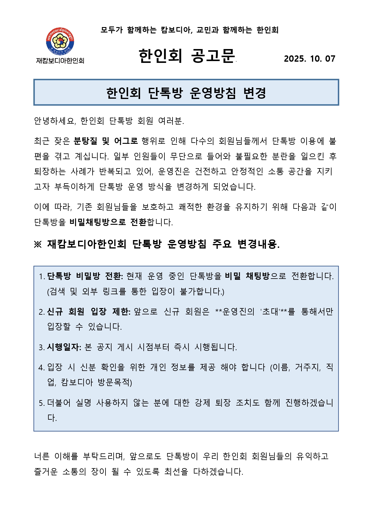 최근 캄보디아 내 취업사기 피해 사례와 각종 분란성 발언으로 인한 혼란이 이어지면서 재캄보디아한인회(회장 정명규)가 공식 단체 대화방(단톡방)의 운영 방침을 전면 개편했다. 한인회는 10월 7일 공문을 통해 “건전하고 안정적인 소통 공간을 유지하기 위해 기존 공개방을 비밀 채팅방으로 전환한다”고 밝혔다.