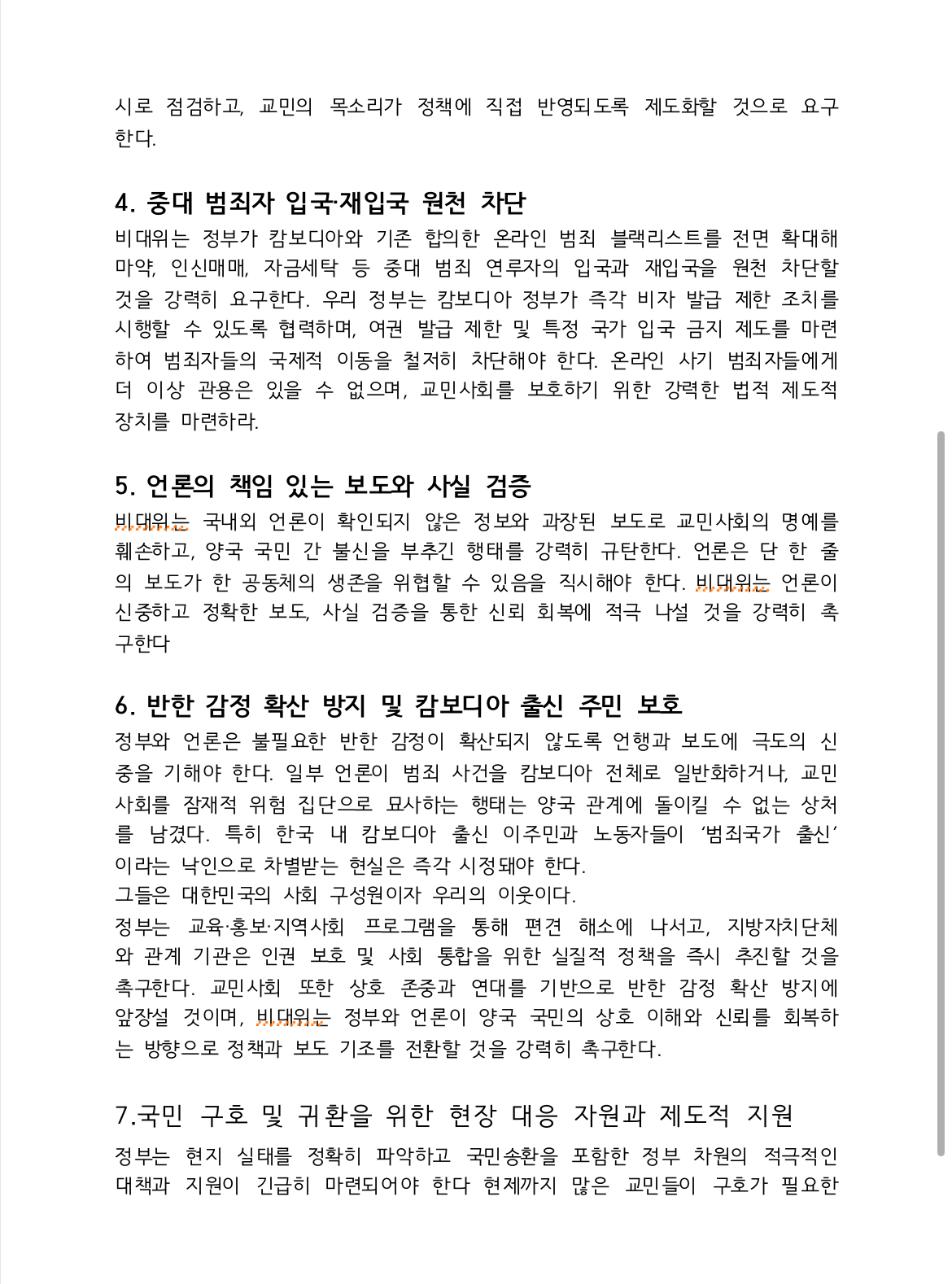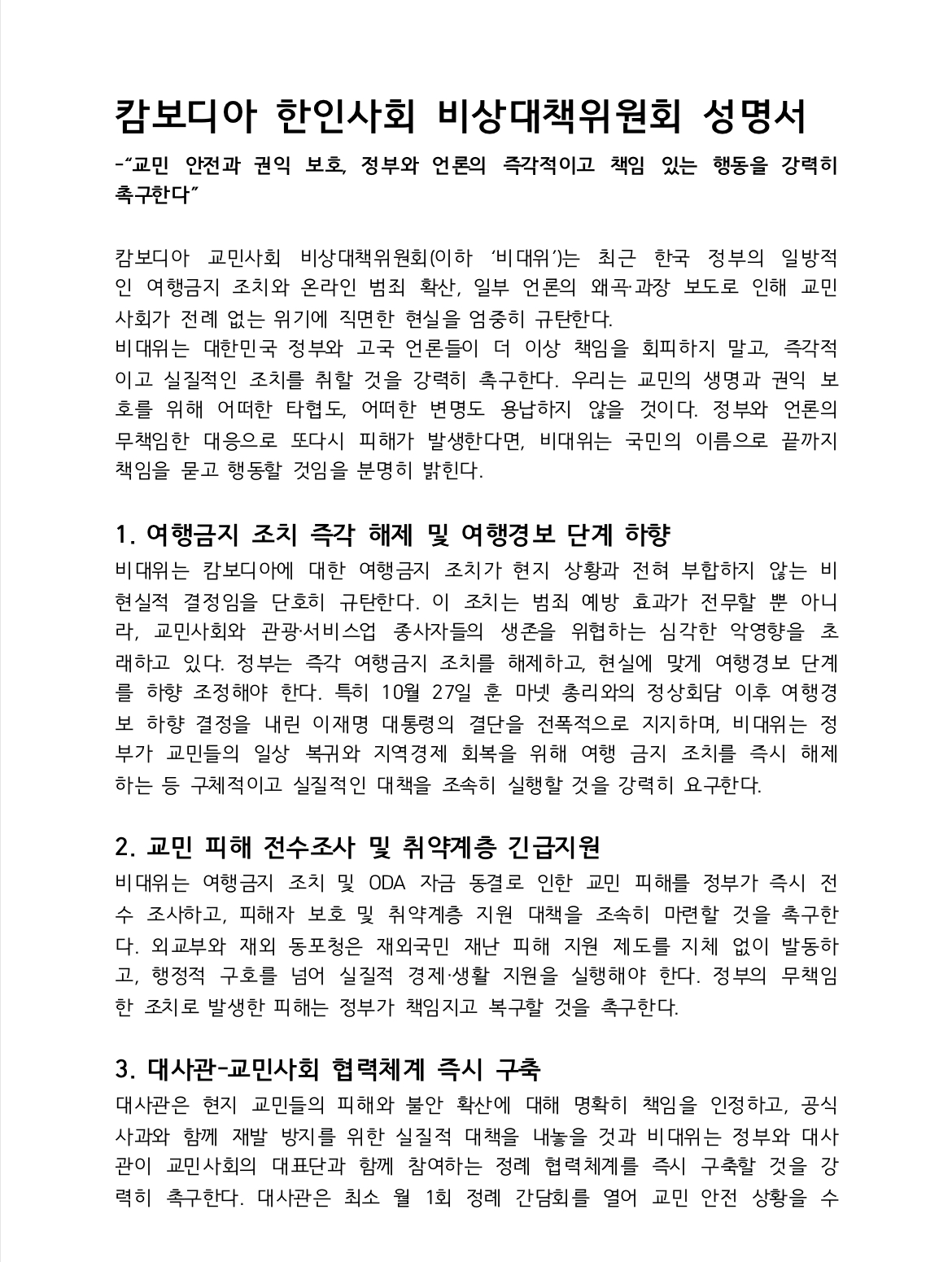 ① 여행금지 조치의 즉각 해제와 경보 단계 하향, ② 언론의 책임 있는 보도와 사실 검증, ③ 대사관-교민사회 협력체계의 즉시 구축, ④ 중대 범죄자의 입국·재입국 원천 차단, ⑤ 교민 피해 전수조사 및 취약계층 긴급지원, ⑥ 반한 감정 확산 방지와 재한 캄보디아인 권익 보호, ⑦ 국민 구호 및 귀환을 위한 제도적 지원 촉구, ⑧ 전략적 외교 복원과 글로벌 대한민국의 품격 회복이다.