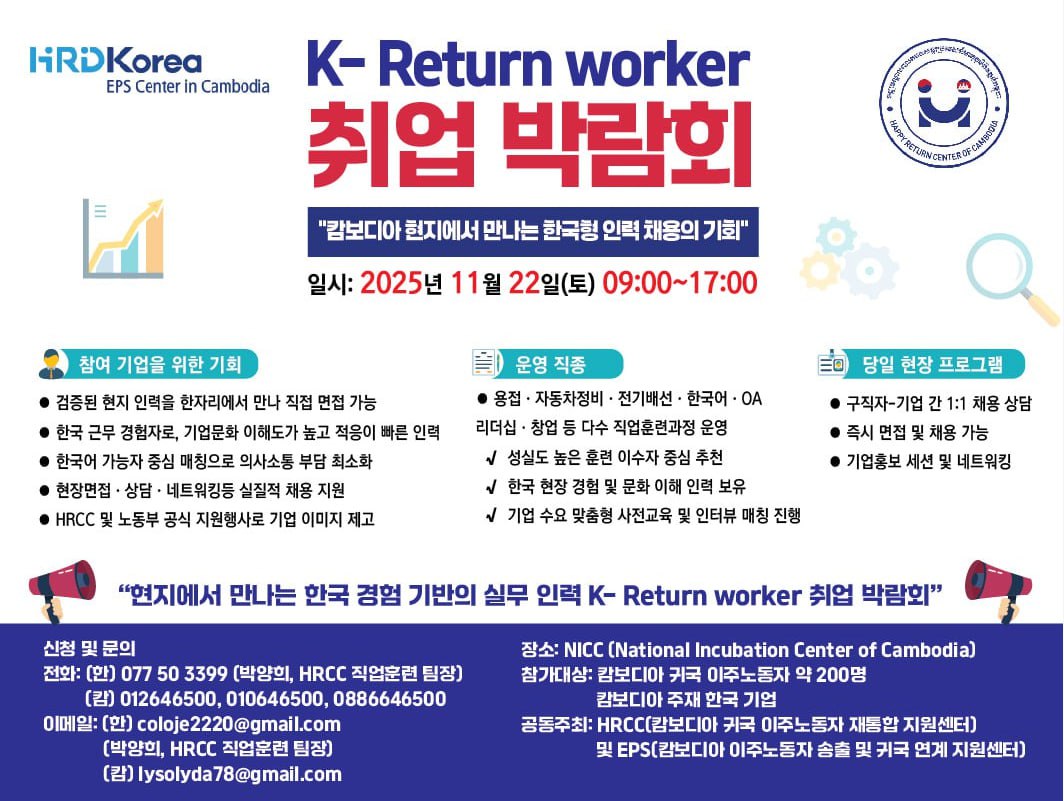 한국에서의 근로 경험을 가진 캄보디아 귀환 근로자들을 만날 수 있는 ‘K-Return Worker 취업 박람회’가 오는 11월 22일(토) 오전 9시부터 오후 5시까지 프놈펜 왕립대학교 내 NICC(National Incubation Center of Cambodia)에서 열린다. 이번 박람회는 HRCC(캄보디아 귀국 이주노동자 재활 및 지원센터, 센터장 박남순)와 한국산업인력공단 캄보디아 센터(HRD Korea EPS Center in Cambodia, 센터장 김운덕)가 공동 주최한다.