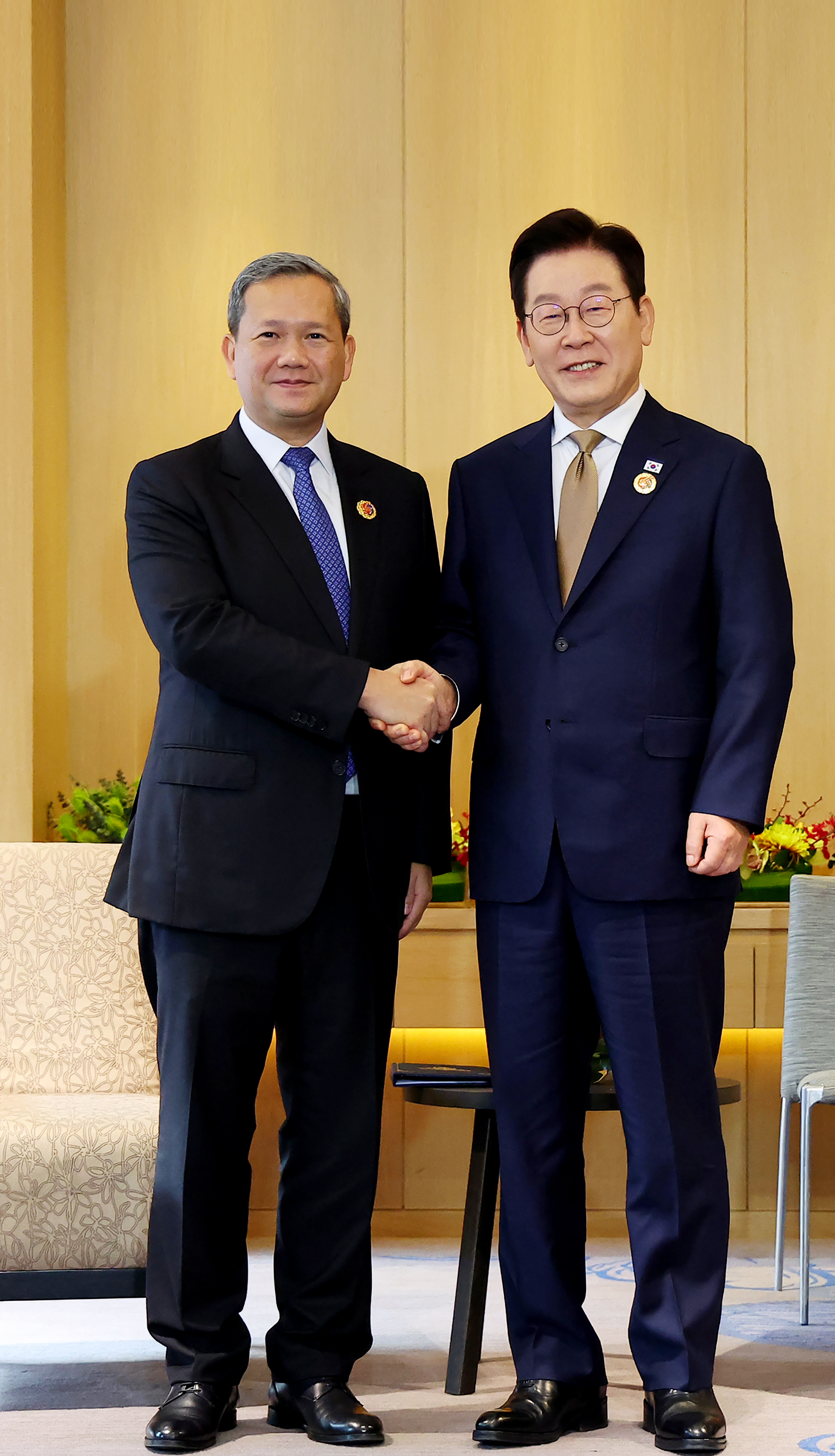 [1060호] 말레이시아 쿠알라룸푸르에서 열린 한-캄 정상회담에서 훈 마넷 총리와 이재명 대통령이 악수를 나누고 있다.