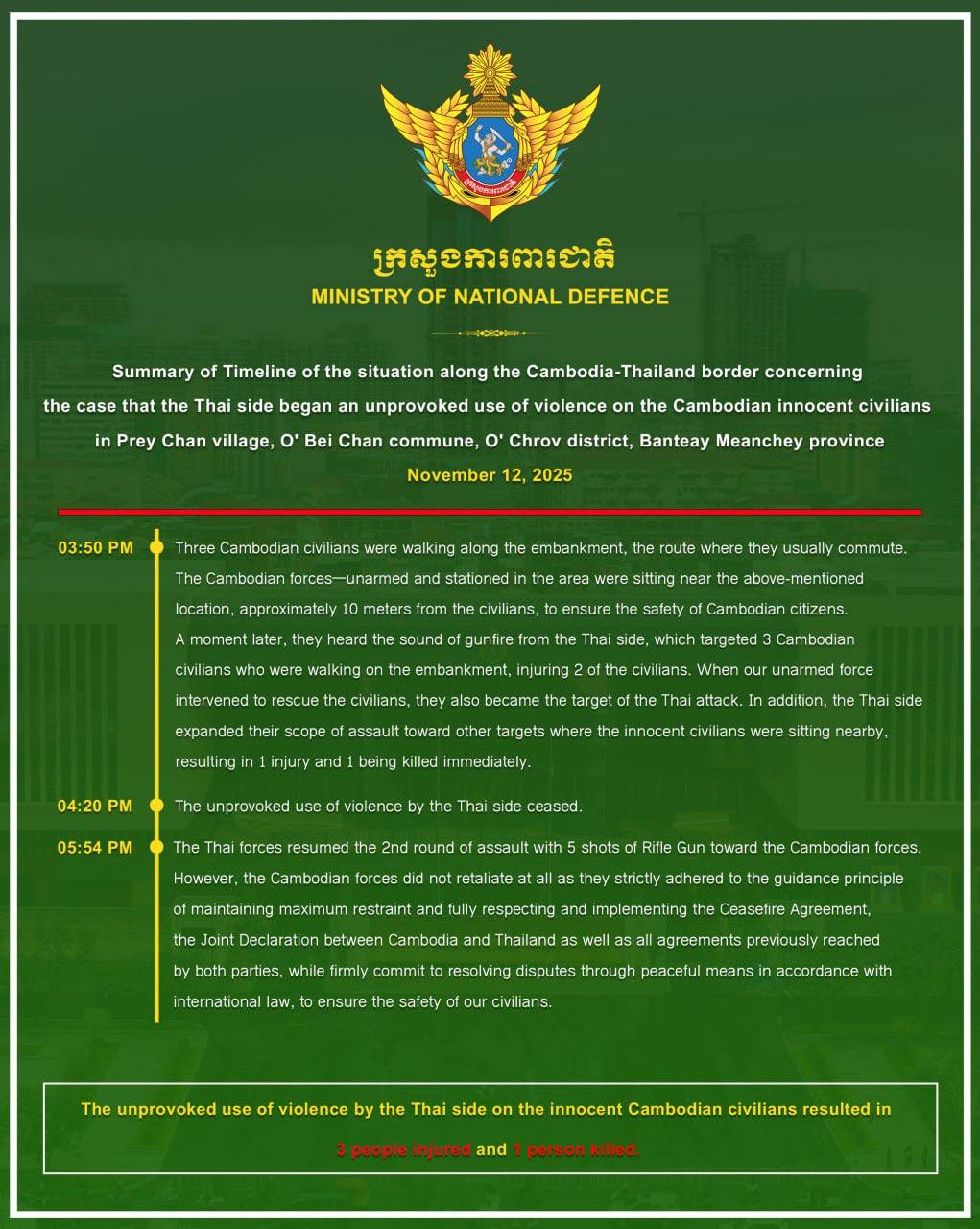 캄보디아 국방부는 11월 12일 발표한 공식 보고를 통해 캄보디아–태국 국경 지역에서 태국군의 무력 사용으로 캄보디아 민간인 1명이 사망하고 3명이 부상하는 사건이 발생했다고 밝혔다. 사건은 반띠에이민쩨이주 오츠로브 군 오바이찬 코뮌 프레이찬 마을 인근 둑길에서 일어났으며 평소처럼 통행하던 캄보디아 민간인 3명이 오후 3시 50분경 태국군의 총격을 받으면서 시작됐다.