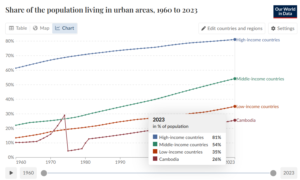 대부분의 고소득 국가들, 즉 서유럽, 아메리카, 호주, 일본, 중동 지역에서는 인구의 80% 이상이 도시 지역에 거주하고 있습니다. 그리고 중 상위 소득 국가들, 즉 동유럽, 동아시아, 북부 및 남부 아프리카, 남아메리카에서는 50%에서 80% 사이의 인구가 도시 지역에 거주하고 있고, 많은 저소득 및 중하위 소득 국가들은 여전히 대다수가 농촌 지역에 거주하고 있는 것을 볼 수 있습니다. 캄보디아의 도시인구 비중은 26%로 저소득 국가 평균보다도 낮은 수준이네요. (* 1970년 – 1980년 사이의 캄보디아 도시화 인구 그래프를 보면, 참으로 안타깝다는 생각이 듭니다. 이렇게 극단적인 역사를 가진 나라가 또 있을까요.)
