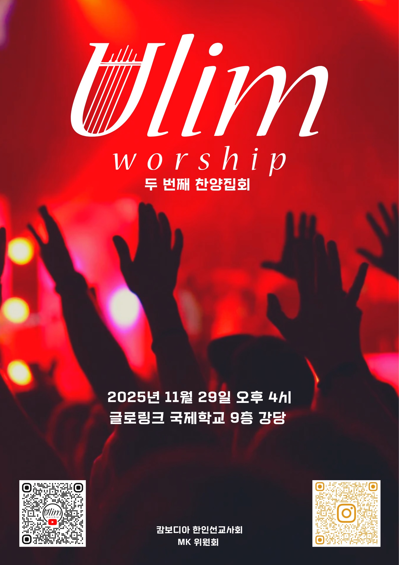 주캄보디아 한인 선교사회 산하 MK위원회 소속 청소년 찬양팀 ‘울림워십(Ulim Worship)’이 오는 11월 29일(토) 오후 4시, 글로링크 국제학교 9층 강당에서 정기 찬양집회를 연다.