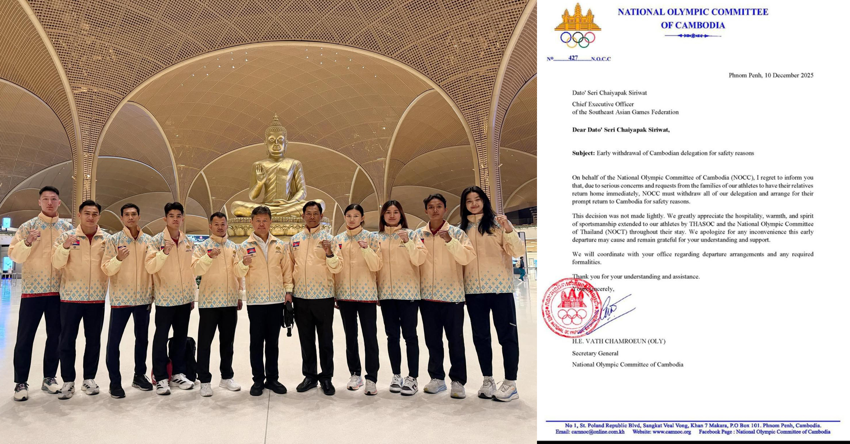 캄보디아 국가올림픽위원회(NOCC)가 태국에서 개최 중인 SEA Games에 참가한 캄보디아 선수단을 조기 귀국시키기로 결정하고 공식 통보문을 12월 10일자 발송했다. 이번 조치는 최근 캄보디아-태국 국경 충돌로 인한 안전 우려가 제기되면서 선수 가족들의 요청이 이어진 데 따른 것으로 알려졌다.