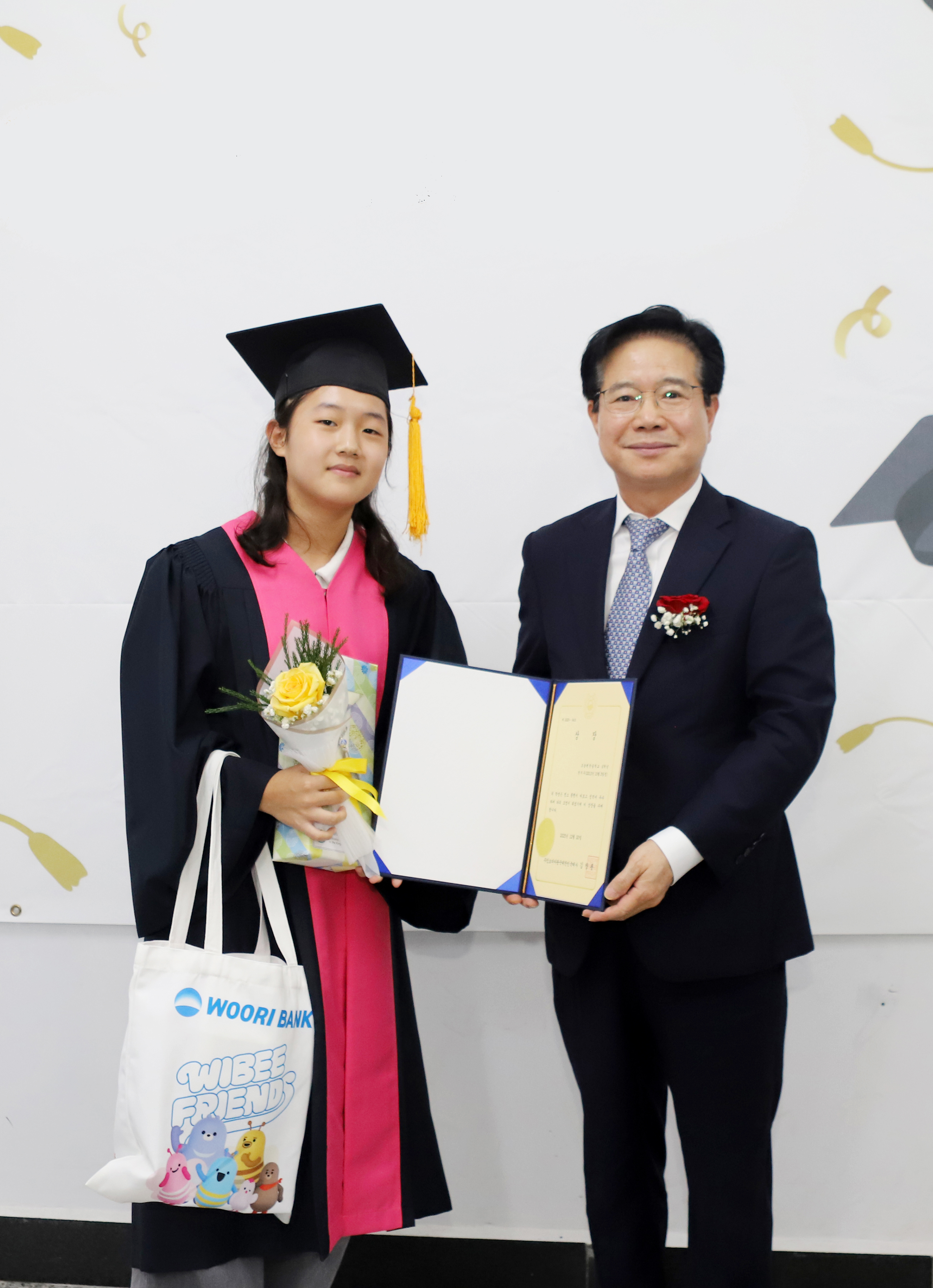 [1067호] 프놈펜한글학교 졸업식에서 대사상을 수상한 한지우 학생(왼쪽)과 김창룡 주캄보디아 대한민국 대사(오른쪽).
