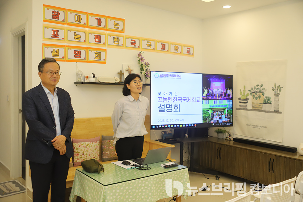▲프놈펜한국국제학교가 12월 30일 프놈펜 센속구 아라따 단지 내에서 <찾아가는 프놈펜한국국제학교 설명회>를 열고 고등학교 운영과정 불승인 통보 및 초등, 중등 학사과 한국국제학교 비전에 대해 안내했다. 이원근 운영이사(왼쪽), 윤진경 초등 교무부장 교사(오른쪽)