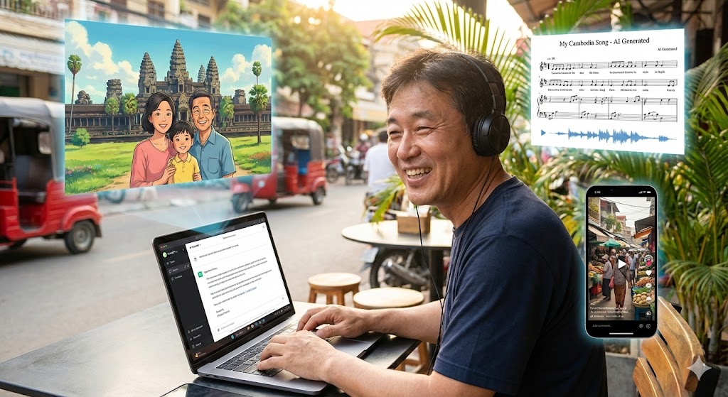 중장년층 인구가 많은 편인 캄보디아 교민들도 이런 흐름 속에서 뒤처지지 말아야겠다는 공감대가 형성됐습니다. 2024년 4월 청년기업가 대상으로 AI 세미나가 열린 것을 시작으로, 2024년 11월 필자는 코윈(KOWIN) 주최 캄보디아 교민 대상 생성형 AI 강의를 진행했습니다. 이날 강의에서 AI 서비스의 특징을 소개하고 직접 마케팅 문구도 써 보면서 보여드렸는데, 특히 인상 깊었던 장면은 AI 음악 생성 서비스인 Suno를 활용해 즉석에서 노래를 만들어보는 시연이었습니다. 가사 몇 줄과 분위기만 입력했을 뿐인데 AI가 곡을 만들고 노래까지 부르자 강연장의 반응은 폭발적이었습니다. 즉석에서 가족 노래, 자신이 속한 단체에 대한 노래를 만들어 보는 교민들도 계셨습니다. 이런 경험은 많은 교민들에게 AI를 “어렵고 차가운 기술”이 아니라 “재미있고 친숙한 도구”로 다가가게 했습니다.
