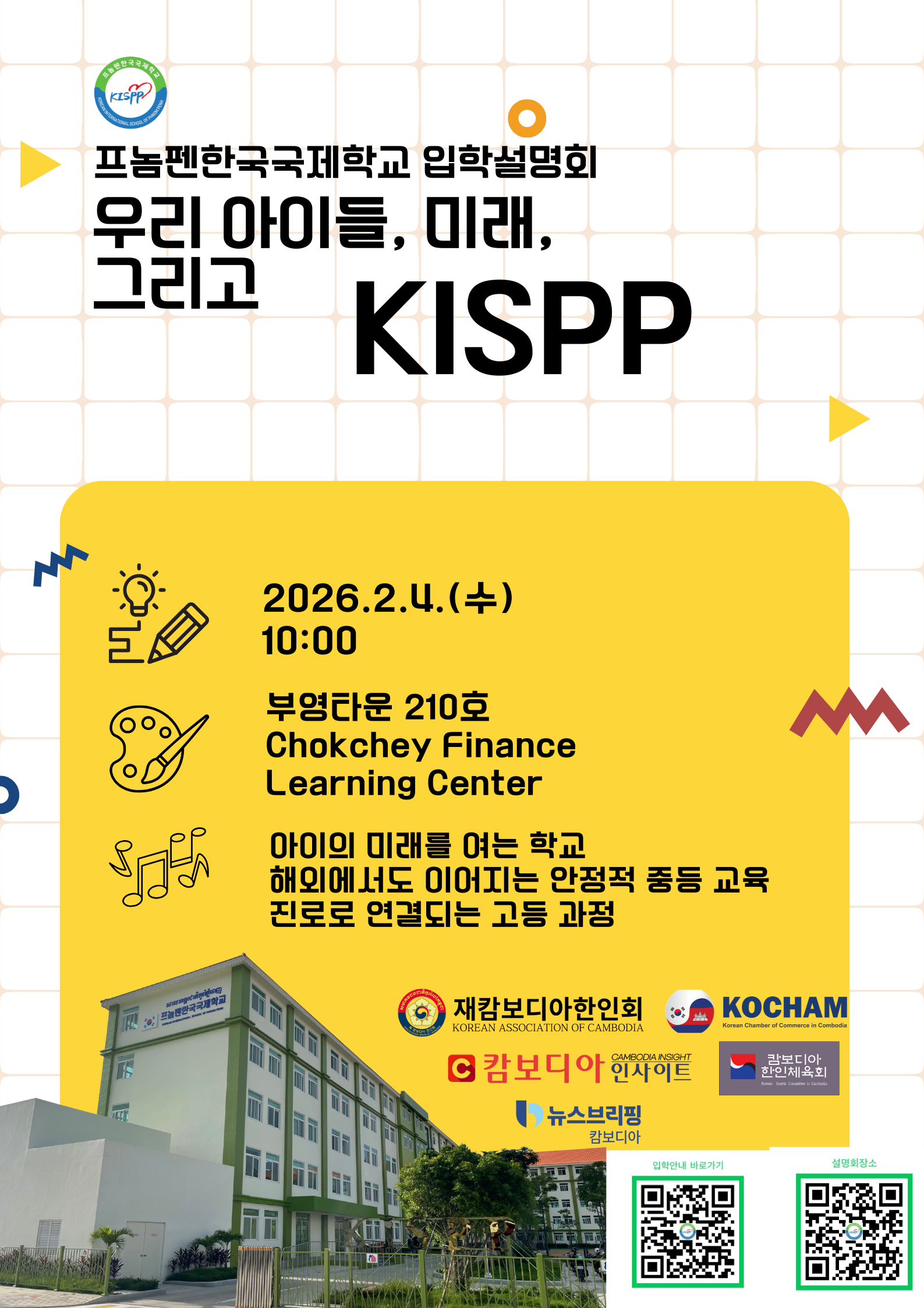 KISPP는 해외에서도 안정적으로 이어지는 초등 및 중등 교육을 체계적으로 운영하고 있는 국제학교로 주목받고 있다. 이번 입학설명회에서는 학교의 교육 철학과 커리큘럼, 학생 지원 프로그램 등을 직접 확인할 수 있을 예정이다. 설명회는 부영타운 21호에 위치한 Chokchey Finance Learning Center에서 진행된다. 참가 신청은 포스터에 안내된 QR코드를 통해 사전 등록할 수 있다.