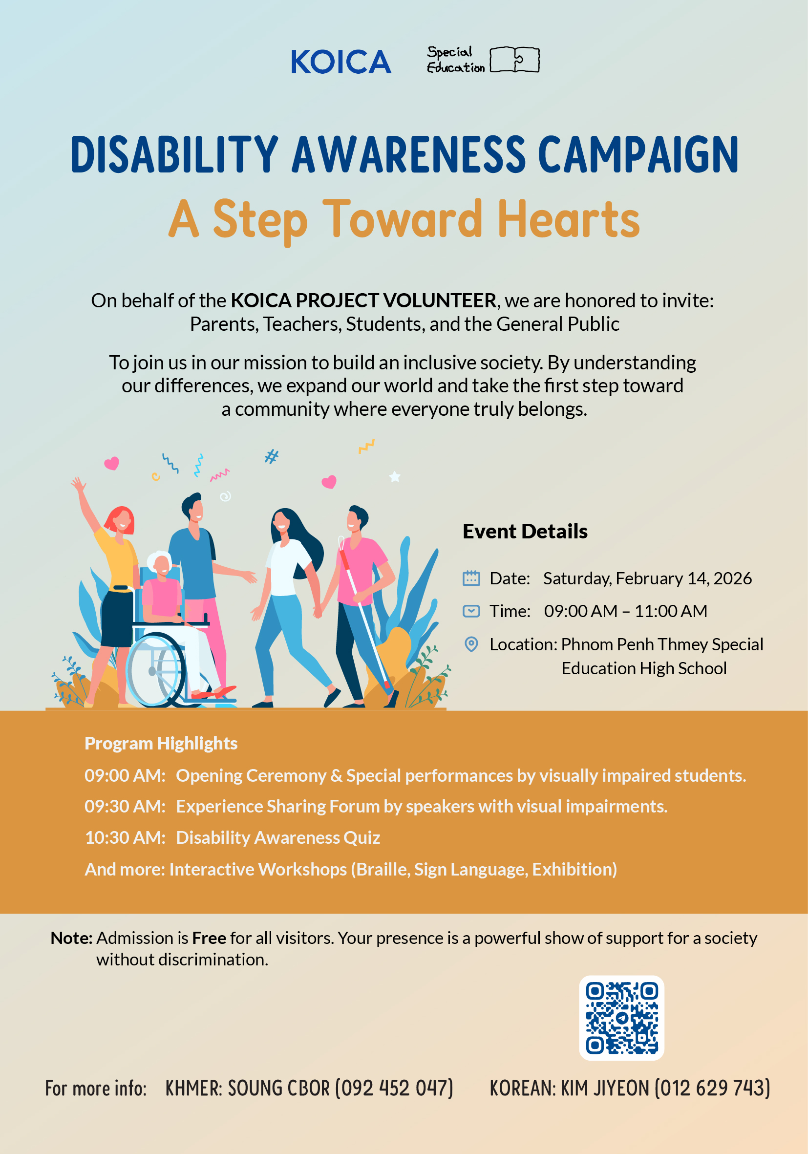 KOICA 프로젝트 봉사단은 오는 2월 14일 오전 9시부터 11시까지 프놈펜 소재 트머이 특수학교(Phnom Penh Thmey Special Education High School)에서 장애 이해 캠페인 ‘이해 한 걸음’을 개최한다. 국립특수교육원(NISE) 및 트머이 특수학교와 협력하여 진행되는 이번 행사는 체험형 부스 운영을 통해 장애 감수성을 높이고 포용적인 지역사회 분위기를 조성하기 위해 마련되었다.