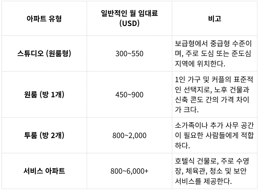 2026년 초반의 최근 임대 데이터에 따르면 외국인들에게 인기 있는 아파트의 대략적인 월 임대료는 다음과 같다.