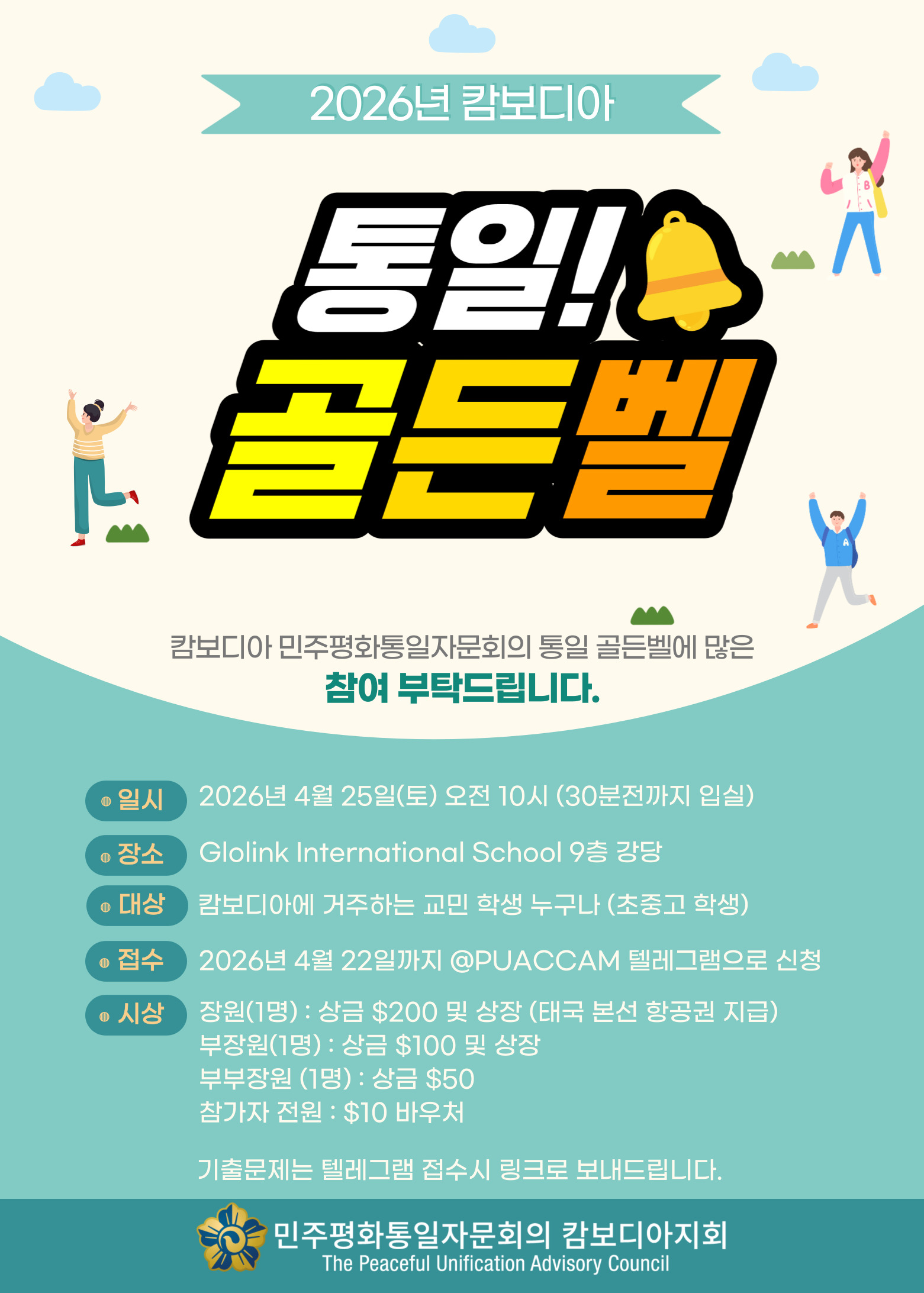 한편, 이번 행사는 민주평화통일자문회의 캄보디아지회가 주관하며, 캄보디아 내 교민 사회 청소년들의 참여를 통해 평화통일 공감대를 넓히는 계기가 될 전망이다.